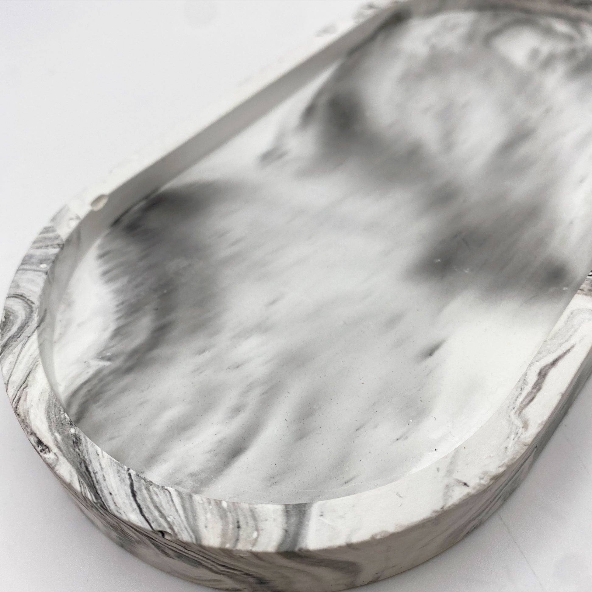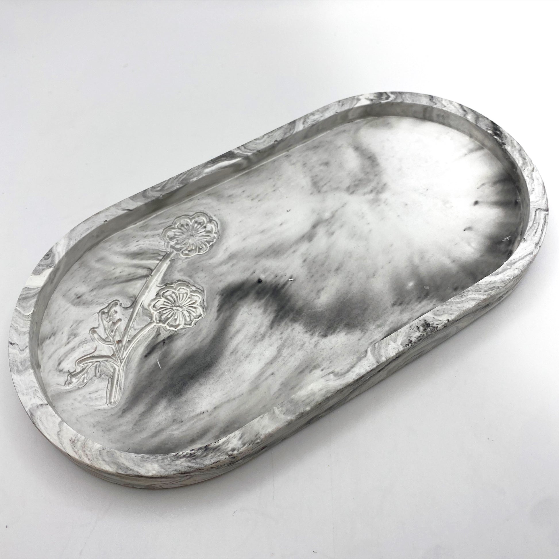Dieses elegante, handgefertigte Tablett besticht durch seine edle Marmoroptik und die zarte Blumenprägung. Die ovale Form macht es zu einem vielseitigen Accessoire – ideal als Ablage für Schmuck, Kerzen oder kleine Dekoartikel.